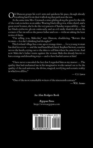 Old Duncan grasps his son's arm and quickens his pace, though already breathing hard from their walk along that path near the sea. At the same time Mrs. Catanach comes gliding along the grass by the side of the road, noiseless as an adder. Wearing black silk gown, white shawl, and a great straw bonnet, she looks the very pattern of Sunday respectability . . . but her black eyebrows gloom ominously, and an evil smile shadows about the corners of her mouth as she passes father and son -- without taking the least notice of them. "I'm telling you, Malcolm," says Duncan, shuddering. "Beware that woman -- for she's thinking bad thoughts!" This lowland village has come upon strange times . . . for a young woman has died in sorrow -- and the mad hunchback laird, Stephen Stewart, scurries across the heath, crying out to the skies to tell him where he came from. And now Malcolm's father warns against the woman Malcolm already knows to have strange and disturbing ways -- and to have hurled curses at him!