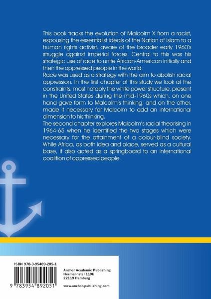 This book tracks the evolution of Malcolm X from a racist, espousing the essentialist ideals of the Nation of Islam to a human rights activist, aware of the broader early 1960 s struggle against imperial forces. Central to this was his strategic use of race to unite African-American initially and then the oppressed people in the world. Race was used as a strategy with the aim to abolish racial oppression. In the first chapter of this study we look at the constraints, most notably the white power structure, present in the United States during the mid-1960s which, on one hand gave form to Malcolm s thinking, and on the other, made it necessary for Malcolm to add an international dimension to his thinking. The second chapter explores Malcolm s racial theorising in 1964-65 when he identified the two stages which were necessary for the attainment of a colour-blind society. While Africa, as both idea and place, served as a cultural base, it also acted as a springboard to an international coalition of oppressed people. By linking the domestic and the international politics of Malcolm X, this study highlights the sense of purpose with which Malcolm X articulated his arguments concerning the future of the African-American community and their involvement in the American society.