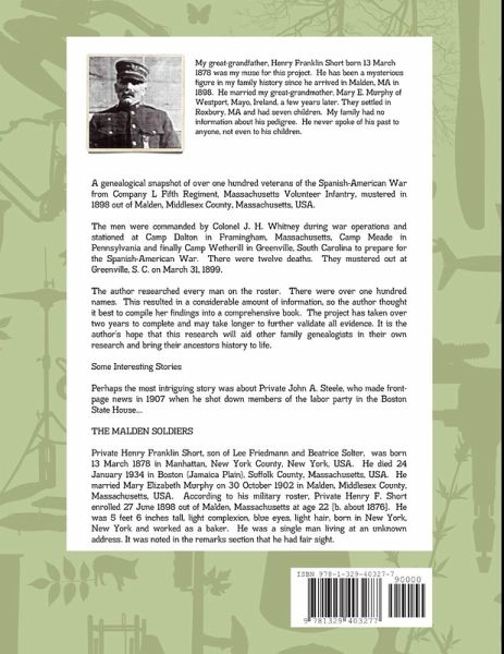 A genealogical snapshot of over one hundred veterans of the Spanish-American War from Company L Fifth Regiment, MA Volunteer Infantry, 1898 out of Malden, MA, USA. Surnames: BACON, BAKENHUS, BARNES, BELL, BERG, BLADES, BLOOMER, BOOTH, BRACKETT, BRIGGS, BROMAN, BUCKLEY, BURNHAM, CARPENTER, CARRAGHER, CARTER, CAVILLE, COFREN, CRANE, CUTTING, DALTON, DAMMERS, DANIELS, DYER, FALL, FELDERMANN, FROST, FUNK, GERTZ, GILMORE, GROSSER, HANNA, HARDENBROOK, HAVERSTOCK, HENDERSON, HEWITT, HIRTLE, HOLLIS, HOLMES, HOUDE, KELLEY, KENNEDY, KEOUGH, LABELLE, LACASS, LAWLER, LOONEY, LORING, LUTES, LUTZ, LYONS, MACY, MAHER, MAHONEY, MANN, MCALLISTER, MCGINNISS, MCKEE, MCLAUGHLIN, MILLER, MITCHELL, MIXTER, MURPHY, NICHOLS, PARKER, PEDLAR, PERCY, PERKINS, QUINN, RAND, REIDY, RICHARDS, RILEY, RIPLEY, ROBY, ROCKWOOD, SALLENGER, SHORT, SILVA, SMALLE, SMITH, SPOFFORD, STEELE, STRACHAN, SWEETSTER, TAYLOR, THOMPSON, TOLMAN,TUCKER, TWISS, ULM, VOS BURGH, WHITE, WILLIAMS, WILSON, WOODBERRY, WOODS