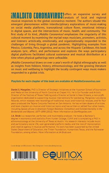 ¡Maldito Coronavirus! offers an expansive survey and analysis of local and regional musical responses to the global coronavirus moment. The authors situate this emergent phenomenon within interdisciplinary explorations of music-making on social media platforms, transnational culture flows, emotional intimacy in digital spaces, and the intersections of music, health, and community. The first study of its kind, ¡Maldito Coronavirus! emphasizes the singularity of this cultural moment by examining the myriad ways musicians, promoters, activists, and listeners artistically, emotionally, and organizationally responded to the challenges of living through a global pandemic. Highlighting examples from Mexico, Colombia, Peru, Argentina, and across the Hispanic Caribbean, this book analyzes lyric, affect, and performance and explores the ways participatory digital platforms facilitated cultural sustenance and musical distribution at a time when physical gatherings were unfeasible. ¡Maldito Coronavirus! draws on over a year's worth of digital ethnography as well as insights from folklore, history, ethnomusicology, and the growing literature on music and wellbeing to highlight the locally contingent ways music-makers responded to a global crisis.