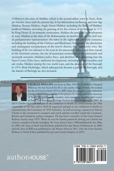 A History is the story of Maldon, which is the second-oldest town in Essex, from pre-historic times until the present day. It has information on Bronze- and Iron-Age Maldon; Roman Maldon; Anglo-Saxon Maldon, including the Battle of Maldon; medieval Maldon, including the granting of the first charter of the borough in 1171 by King Henry II, its monastic institutions, Maldon the port, and its involvement in wars; Maldon at the time of the Reformation; its involvement in the civil war; its parliamentary representation; the town in the eighteenth and early centuries, including the building of the Chelmer and Blackwater Navigation, the dissolution and subsequent reinstatement of the town's charter, the Napoleonic wars, the building of the two railways to the town in the nineteenth century and their closure in the twentieth century, the rise of municipal institutions in the nineteenth and twentieth centuries, Maldon's police force, and abolition and subsuming into the Essex County Police force, industrial developments, including its iron foundries and salt works; Maldon during the two world wars, and the abolition of the borough in 1974. Both Heybridge, which subsequently became a part of the borough, and the hamlet of Beeleigh are also included.