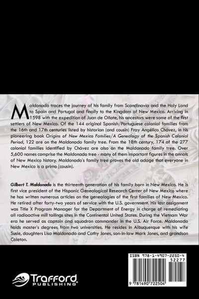 Maldonado traces the journey of his family from Scandinavia and the Holy Land to Spain and Portugal and finally to the Kingdom of New Mexico. Arriving in 1598 with the expedition of Juan de Oñate, his ancestors were some of the first settlers of New Mexico. Of the 144 original Spanish/Portuguese colonial families from the 16th and 17th centuries listed by historian and cousin Fray Angélico Chávez, in his pioneering book Origins of New Mexico Families/A Genealogy of the Spanish Colonial Period, 119 are on the Maldonado family tree. From the 18th century, 174 of the 277 colonial families identified by Chávez are also on the Maldonado family tree. Over 5,300 names comprise the Maldonado tree - many of them important figures in the annals of New Mexico history. Maldonado's family tree proves the old adage that everyone in New Mexico is a primo, cousin.