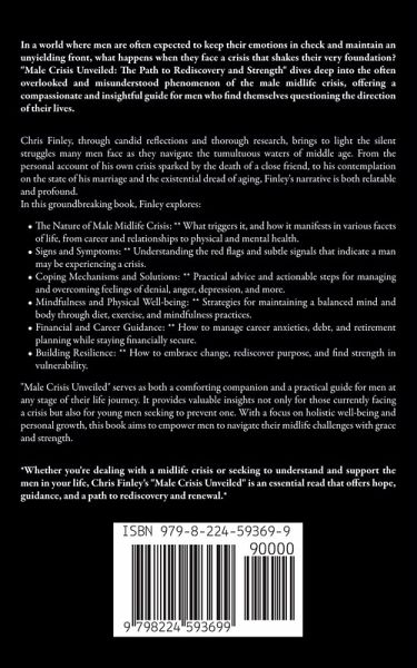 In a world where men are often expected to keep their emotions in check and maintain an unyielding front, what happens when they face a crisis that shakes their very foundation? "Male Crisis Unveiled: The Path to Rediscovery and Strength" dives deep into the often overlooked and misunderstood phenomenon of the male midlife crisis, offering a compassionate and insightful guide for men who find themselves questioning the direction of their lives. Chris Finley, through candid reflections and thorough research, brings to light the silent struggles many men face as they navigate the tumultuous waters of middle age. From the personal account of his own crisis sparked by the death of a close friend, to his contemplation on the state of his marriage and the existential dread of aging, Finley's narrative is both relatable and profound. In this groundbreaking book, Finley explores:The Nature of Male Midlife Crisis: ** What triggers it, and how it manifests in various facets of life, from career and relationships to physical and mental health. Signs and Symptoms: ** Understanding the red flags and subtle signals that indicate a man may be experiencing a crisis. Coping Mechanisms and Solutions: ** Practical advice and actionable steps for managing and overcoming feelings of denial, anger, depression, and more. Mindfulness and Physical Well-being: ** Strategies for maintaining a balanced mind and body through diet, exercise, and mindfulness practices. Financial and Career Guidance: ** How to manage career anxieties, debt, and retirement planning while staying financially secure. Building Resilience: ** How to embrace change, rediscover purpose, and find strength in vulnerability. "Male Crisis Unveiled" serves as both a comforting companion and a practical guide for men at any stage of their life journey. It provides valuable insights not only for those currently facing a crisis but also for young men seeking to prevent one. With a focus on holistic well-being and personal growth, this book aims to empower men to navigate their midlife challenges with grace and strength. *Whether you're dealing with a midlife crisis or seeking to understand and support the men in your life, Chris Finley's "Male Crisis Unveiled" is an essential read that offers hope, guidance, and a path to rediscovery and renewal.*