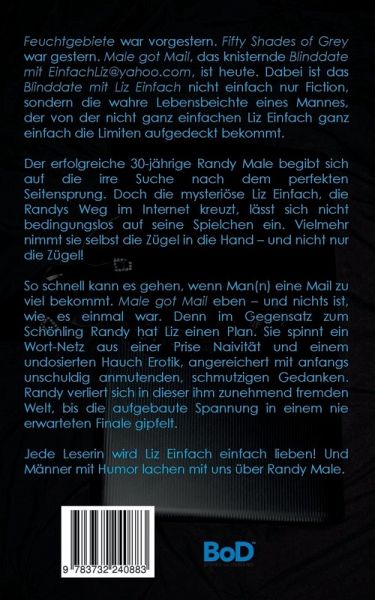 Feuchtgebiete war vorgestern. Fifty Shades of Grey war gestern. Male got Mail, das knisternde Blinddate mit EinfachLiz@yahoo.com, ist heute. Dabei ist das Blinddate mit Liz Einfach nicht einfach nur Fiction, sondern die wahre Lebensbeichte eines Mannes, der von der nicht ganz einfachen Liz Einfach ganz einfach die Limiten aufgedeckt bekommt. Der erfolgreiche 30-jährige Randy Male begibt sich auf die irre Suche nach dem perfekten Seitensprung. Doch die mysteriöse Liz Einfach, die Randys Weg im Internet kreuzt, lässt sich nicht bedingungslos auf seine Spielchen ein. Vielmehr nimmt sie selbst die Zügel in die Hand - und nicht nur die Zügel! So schnell kann es gehen, wenn Man(n) eine Mail zu viel bekommt. Male got Mail eben - und nichts ist, wie es einmal war. Denn im Gegensatz zum Schönling Randy hat Liz einen Plan. Sie spinnt ein Wort-Netz aus einer Prise Naivität und einem undosierten Hauch Erotik, angereichert mit anfangs unschuldig anmutenden, schmutzigen Gedanken. Randy verliert sich in dieser ihm zunehmend fremden Welt, bis die aufgebaute Spannung in einem nie erwarteten Finale gipfelt. Jede Leserin wird Liz einfach lieben! Und Männer mit Humor lachen mit uns über Randy Male.