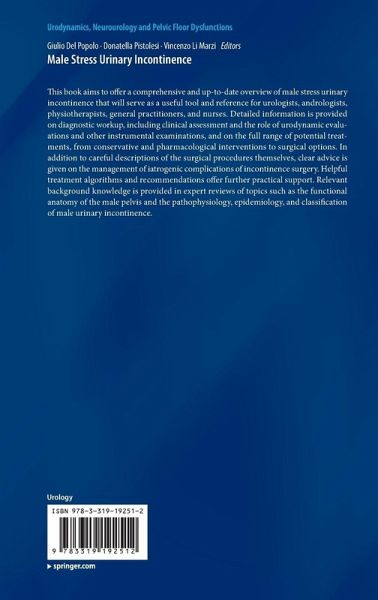 This book aims to offer a comprehensive and up-to-date overview of male stress urinary incontinence that will serve as a useful tool and reference for urologists, andrologists, physiotherapists, general practitioners, and nurses. Detailed information is provided on diagnostic workup, including clinical assessment and the role of urodynamic evaluations and other instrumental examinations, and on the full range of potential treatments, from conservative and pharmacological interventions to surgical options. In addition to careful descriptions of the surgical procedures themselves, clear advice is given on the management of iatrogenic complications of incontinence surgery. Helpful treatment algorithms and recommendations offer further practical support. Relevant background knowledge is provided in expert reviews of topics such as the functional anatomy of the male pelvis and the pathophysiology, epidemiology, and classification of male urinary incontinence.