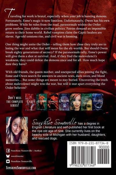 Monsters are coming. Allies are turning. But Esme has evolved. Traveling for work is brutal, especially when your job is hunting demons. Fortunately, Esme's magic is now limitless. Unfortunately, Owen has his own problems. While he rules from the road, paranormals within the Order grow restless. Jinn dabble in civilian politics. Fairies demand an impossible return to their home world. Rebel vampires claim the Capiti healers are slaves. Age-old tensions rise, and civil war is looming. One thing might unite the Order - telling them how close they truly are to losing the war and what that will mean for the alt-worlds. But should Owen break eighty generations of secrecy? If the paranormals rally, Esme's power will give them a shot at survival. And, if they find the malevolenci's weakness, they could defeat the demons once and for all. How much hope dare they have? With old friends, the queen mother, and unexpected allies joining the fight, Esme and Owen search for answers in ancient texts, dark caves, and blood memories... But some things are meant to stay buried. Uncovering the truth about malevolenci might win the war, but will it tear apart everything the Order believes?