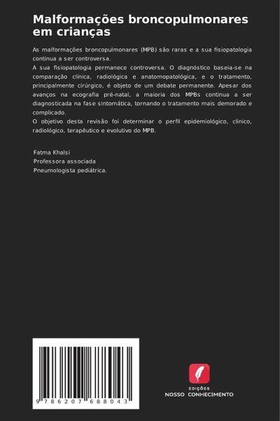 As malformações broncopulmonares (MPB) são raras e a sua fisiopatologia continua a ser controversa.A sua fisiopatologia permanece controversa. O diagnóstico baseia-se na comparação clínica, radiológica e anatomopatológica, e o tratamento, principalmente cirúrgico, é objeto de um debate permanente. Apesar dos avanços na ecografia pré-natal, a maioria dos MPBs continua a ser diagnosticada na fase sintomática, tornando o tratamento mais demorado e complicado.O objetivo desta revisão foi determinar o perfil epidemiológico, clínico, radiológico, terapêutico e evolutivo do MPB.