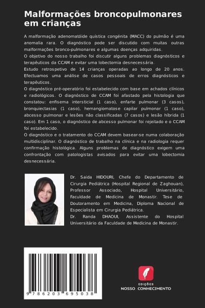 A malformação adenomatóide quística congénita (MACC) do pulmão é uma anomalia rara. O diagnóstico pode ser discutido com muitas outras malformações bronco-pulmonares e algumas doenças adquiridas.O objetivo do nosso trabalho foi discutir alguns problemas diagnósticos e terapêuticos da CCAM e evitar uma lobectomia desnecessária.Estudo retrospetivo de 14 crianças operadas ao longo de 20 anos. Efectuamos uma análise de casos pessoais de erros diagnósticos e terapêuticos.O diagnóstico pré-operatório foi estabelecido com base em achados clínicos e radiológicos. O diagnóstico de CCAM foi afastado pela histologia que constatou: enfisema intersticial (1 caso), enfarte pulmonar (3 casos), bronquiectasias (1 caso), hemangiomatose capilar pulmonar (1 caso), abcesso pulmonar e lesões não classificadas (7 casos) e lesão híbrida (1 caso). Em 1 caso, o diagnóstico de abcesso pulmonar foi rejeitado e o CCAM foi estabelecido.O diagnóstico e o tratamento do CCAM devem basear-se numa colaboração multidisciplinar. O diagnóstico de trabalho na clínica e na radiologia requer confirmação histológica. Alguns problemas de diagnóstico exigem uma confrontação com patologistas avisados para evitar uma lobectomia desnecessária.