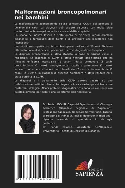 La malformazione adenomatoide cistica congenita (CCAM) del polmone è un'anomalia rara. La diagnosi può essere discussa con molte altre malformazioni broncopolmonari e alcune malattie acquisite.Lo scopo del nostro lavoro è stato quello di discutere alcuni problemi diagnostici e terapeutici della CCAM e di prevenire una lobectomia non necessaria.Uno studio retrospettivo su 14 bambini operati nell'arco di 20 anni. Abbiamo effettuato un'analisi dei casi personali di errori diagnostici e terapeutici.La diagnosi preoperatoria è stata stabilita in base ai risultati clinici e radiologici. La diagnosi di CCAM è stata scartata dall'istologia che ha rilevato: enfisema interstiziale (1 caso), infarto polmonare (3 casi), bronchiectasie (1 caso), emangiomatosi capillare polmonare (1 caso), ascesso polmonare e lesioni non classificate (7 casi) e lesione ibrida (1 caso). In 1 caso, la diagnosi di ascesso polmonare è stata rifiutata ed è stata stabilita la CCAM.La diagnosi e il trattamento della CCAM devono basarsi su una collaborazione multidisciplinare. La diagnosi clinica e radiologica richiede una conferma istologica. Alcuni problemi diagnostici richiedono un confronto con patologi avvertiti per evitare una lobectomia non necessaria.