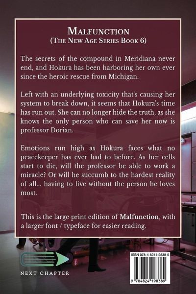 The secrets of the compound in Meridiana never end, and Hokura has been harboring her own ever since the heroic rescue from Michigan. Left with an underlying toxicity that's causing her system to break down, it seems that Hokura's time has run out. She can no longer hide the truth, as she knows the only person who can save her now is professor Dorian. Emotions run high as Hokura faces what no peacekeeper has ever had to before. As her cells start to die, will the professor be able to work a miracle? Or will he succumb to the hardest reality of all... having to live without the person he loves most. This is the large print edition of Malfunction, with a larger font / typeface for easier reading.