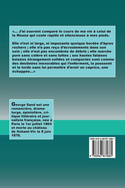 ... J'ai souvent comparé le cours de ma vie à celui de la Meuse qui coule rapide et silencieuse à mes pieds. Elle n'est ni large, ni imposante quoique bordée d'âpres rochers ; elle n'a pas reçu d'écroulements dans son sein ; elle n'est pas encombrée de débris ; elle marche pure sans colère et sans luttes ; ses hautes falaises boisées étrangement solides et compactes sont comme des destinées inexorables qui l'enferment, la poussent et la torde sans lui permettre d'avoir un caprice, une échappée...