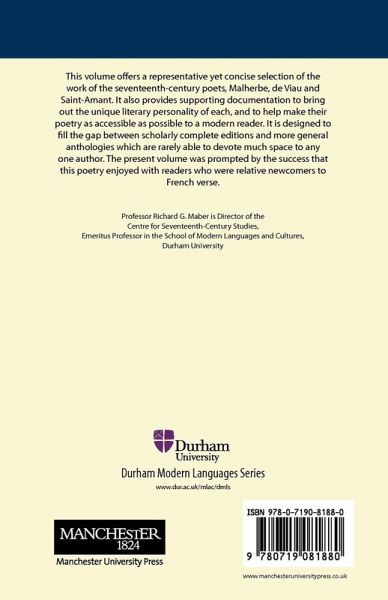 This volume offers a representative yet concise selection of the work of the seventeenth-century poets, Malherbe, de Viau and Saint-Amant. It also provides supporting documentation to bring out the unique literary personality of each, and to help make their poetry as accessible as possible to a modern reader. It is designed to fill the gap between scholarly complete editions and more general anthologies which are rarely able to devote much space to any one author. The present volume was prompted by the success that this poetry enjoyed with readers who were relative newcomers to French verse.