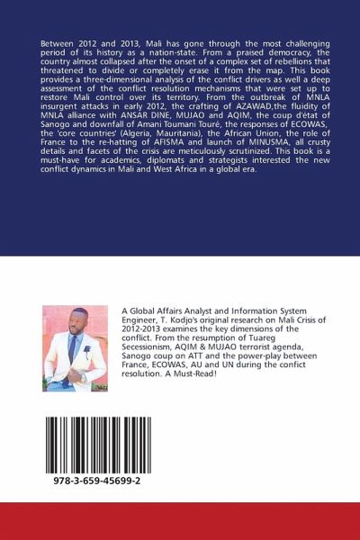 Between 2012 and 2013, Mali has gone through the most challenging period of its history as a nation-state. From a praised democracy, the country almost collapsed after the onset of a complex set of rebellions that threatened to divide or completely erase it from the map. This book provides a three-dimensional analysis of the conflict drivers as well a deep assessment of the conflict resolution mechanisms that were set up to restore Mali control over its territory. From the outbreak of MNLA insurgent attacks in early 2012, the crafting of AZAWAD,the fluidity of MNLA alliance with ANSAR DINE, MUJAO and AQIM, the coup d'état of Sanogo and downfall of Amani Toumani Touré, the responses of ECOWAS, the 'core countries' (Algeria, Mauritania), the African Union, the role of France to the re-hatting of AFISMA and launch of MINUSMA, all crusty details and facets of the crisis are meticulously scrutinized. This book is a must-have for academics, diplomats and strategists interested the new conflict dynamics in Mali and West Africa in a global era.
