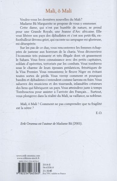 Voulez-vous les dernières nouvelles du Mali ? Madame Bâ Marguerite se propose de vous y emmener. Cette dame, qui n'est pas humble de nature, se prend pour une Grande Royale, une Jeanne d'Arc africaine. Elle veut libérer son pays des djihadistes et c'est son petit-fi ls, exfootballeur devenu griot, qui raconte sa campagne mi-glorieuse, mi-désespérée. Sur les pas de ce duo, vous rencontrerez les femmes échappées de justesse aux horreurs de la charia. Vous découvrirez l'économie très puissante et très illégale dont vit grassement le Sahara. Vous ferez connaissance avec des petits capitaines, soldats d'opérettes, terrorisés par les combats. Vous tomberez sous le charme de leurs épouses prédatrices, frénétiques de la Visa Premier. Vous remonterez le fl euve Niger en évitant toutes sortes de périls. Vous verrez comment et pourquoi bandits et djihadistes s'entendent comme larrons en foire. Vous saluerez des musiciens et des tisserands, inlassables créateurs des liens qui fabriquent un pays. Vous atteindrez juste à temps Tombouctou pour assister à l'arrivée des Français... Surtout, vous plongerez dans la réalité du Mali, sa vaillance, sa noblesse.Mali, ô Mali ! Comment ne pas comprendre que ta fragilité est la nôtre ?E.O.