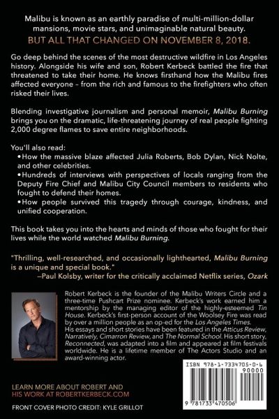 Winner 2020 Independent Publisher Awards (IPPY) - Silver Medalist in Creative Nonfiction Finalist - Foreword Reviews Book of the Year Award Malibu Burning named Best Historical Nonfiction of 2019 by Best of LA Malibu is known as an earthly paradise of multi-million-dollar mansions, movie stars and unimaginable natural beauty. But all that changed on November 8, 2018. Go deep behind the scenes of the most destructive wildfire in Los Angeles history. Alongside his wife and son, Robert Kerbeck battled the fire that threatened to take their home. He knows first-hand how the Malibu fires affected everyone - from the rich and famous to the firefighters who often risked their lives. Blending investigative journalism and personal memoir, Malibu Burning brings you on the dramatic, life-threatening journey of real people fighting 2,000 degree flames to save entire neighborhoods. You'll also read:How the massive blaze affected Julia Roberts, Bob Dylan, Nick Nolte, and other celebrities. Hundreds of interviews with perspectives of locals ranging from the Deputy Fire Chief and Malibu City Council members to residents who fought to defend their homes. How people survived this tragedy through courage, kindness and unified cooperation. This book takes you into the hearts and minds of those who fought for their lives while the world watched Malibu Burning.