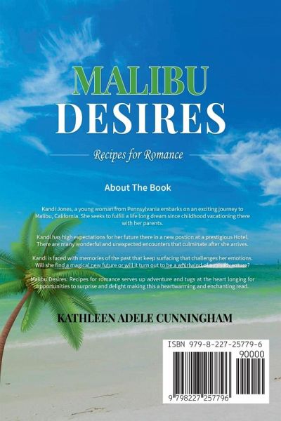Kandi Jones, a young woman from Pennsylvania embarks on an exciting journey to Malibu, California. She seeks to fulfill a life long dream since childhood vacationing there with her parents. Kandi has high expectations for her future there in a new postion at a prestigious Hotel. There are many wonderful and unexpected encounters that culminate after she arrives. Kandi is faced with memories of the past that keep surfacing that challenges her emotions. Will she find a magical new future or will it turn out to be a whirlwind of a misadventure? Malibu Desires: Recipes for romance serves up adventure and tugs at the heart longing for opportunities to surprise and delight making this a heartwarming and enchanting read.