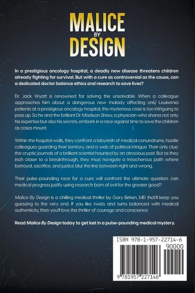 In a prestigious oncology hospital, a deadly new disease threatens children already fighting for survival. But with a cure as controversial as the cause, can a dedicated doctor balance ethics and research to save lives? Dr. Jack Wyatt is renowned for solving the unsolvable. When a colleague approaches him about a dangerous new malady affecting only Leukemia patients at a prestigious oncology hospital, the mysterious case is too intriguing to pass up. So he and the brilliant Dr. Madison Shaw, a physician who shares not only his expertise but also his secrets, embark in a race against time to save the children as cases mount. Within the hospital walls, they confront a labyrinth of medical conundrums, hostile colleagues guarding their territory, and a web of political intrigue. Their only clue: the cryptic journals of a brilliant scientist haunted by an atrocious past. But as they inch closer to a breakthrough, they must navigate a treacherous path where betrayal, sacrifice, and justice blur the line between right and wrong. Their pulse-pounding race for a cure will confront the ultimate question: can medical progress justify using research born of evil for the greater good? Malice By Design is a chilling medical thriller by Gary Birken, MD that'll keep you guessing to the very end. If you like twists and turns balanced with medical authenticity, then you'll love this thriller of courage and conscience. Read Malice By Design today to get lost in a pulse-pounding medical mystery.