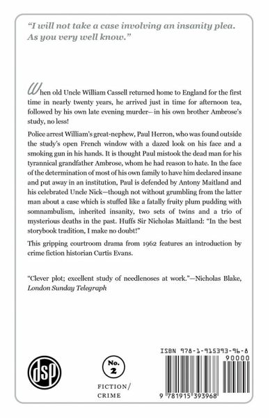 "I will not take a case involving an insanity plea. As you very well know." When old Uncle William Cassell returned home to England for the first time in nearly twenty years, he arrived just in time for afternoon tea, followed by his own late evening murder-in his own brother Ambrose's study, no less! Police arrest William's great-nephew, Paul Herron, who was found outside the study's open French window with a dazed look on his face and a smoking gun in his hands. It is thought Paul mistook the dead man for his tyrannical grandfather Ambrose, whom he had reason to hate. In the face of the determination of most of his own family to have him declared insane and put away in an institution, Paul is defended by Antony Maitland and his celebrated Uncle Nick-though not without grumbling from the latter man about a case which is stuffed like a fatally fruity plum pudding with somnambulism, inherited insanity, two sets of twins and a trio of mysterious deaths in the past. Huffs Sir Nicholas Maitland: "In the best storybook tradition, I make no doubt!" This gripping courtroom drama from 1962 features an introduction by crime fiction historian Curtis Evans. "Clever plot; excellent study of needlenoses at work." - Nicholas Blake, London Sunday Telegraph