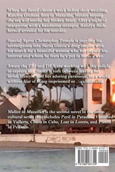 Katelyn Graham catches her betrothed buried in his assistance ample treasure chest and flees to Mazatlán, Mexico hoping the sea will soothe her broken heart. After a night of margaritas with a handsome stranger, Katelyn finds herself arrested for his murder. But being arrested isn't her only problem ... Someone in paradise wants her dead. Special Agent Christopher Temple has been partnered with a beautiful DEA agent as part of a joint agency effort to arrest a drug queen who they believe can help them bring down a notorious cartel leader. What he didn't plan for was a random encounter that also has him searching for a woman he can't stop thinking about ... and who he can't seem to find. Sarita Garcia loves her life. Her sprawling estate in Durango and her newly renovated timeshare in Mazatlán. And, of course, her adoring boy toy Dario. But the time has come to decide what to do about the FBI and DEA agents, who along with the policía are trying to capture her. Should she put her plan in place and leave her lavish lifestyle and her adoring paramour for a world free of worrying about being imprisoned ... or eliminated. Or should she stand her ground.