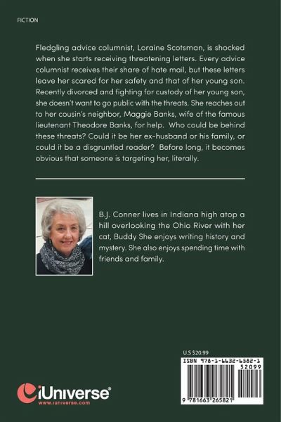 Fledgling advice columnist, Loraine Scotsman, is shocked when she starts receiving threatening letters. Every advice columnist receives their share of hate mail, but these letters leave her scared for her safety and that of her young son. Recently divorced and fighting for custody of her young son, she doesn't want to go public with the threats. She reaches out to her cousin's neighbor, Maggie Banks, wife of the famous lieutenant Theodore Banks, for help. Who could be behind these threats? Could it be her ex-husband or his family, or could it be a disgruntled reader? Before long, it becomes obvious that someone is targeting her, literally.