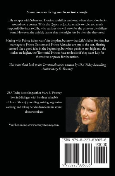 Sometimes sacrificing your heart isn't enough. Lily escapes with Salem and Destino to shifter territory, where deception lurks around every corner. With the Queen of Jacoba unable to rule, too much responsibility falls to Lily, who realizes she will never be the princess the shifters want. However, she quickly learns that she might just be the ruler they need. Mating with Prince Salem wasn't in the plan, but now that Lily's fallen for him, her marriages to Prince Destino and Prince Alexavier are put to the test. Sharing seemed like a good idea in the beginning, but when passions run high and the stakes are higher, the Territorial Princes have to decide if they want Lily for themselves or peace for the nation. This is the third book in the Territorials series, written by USA Today Bestselling Author Mary E. Twomey.