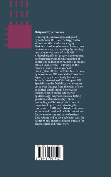 In susceptible individuals, malignant hyperthermia (MH) can be triggered by various anesthetics during surgery. First described in 1960, research since then has concentrated on reducing the very high mortality rate associated with MH. Although significant progress in treatment has been made with the introduction of dantrolene sodium in 1979, many questions remain unanswered. Following on the results of more than 30 years of investigative efforts, the Third International Symposium on MH was held in Hiroshima, Japan, in 1994, immediately before the Seventh International Workshop on MH. Specialists in the field discussed the most up-to-date findings from the point of view of clinical classification, history, and incidence based on the evidence of epidemiology, diagnostic muscle testing, genetics, and biochemistry. These proceedings of the symposium present important keys to understanding the mechanism of MH and related syndromes at the genetic level and include procedures for the monitoring and care of patients. This volume will be invaluable not only for surgeons and anesthesiologists but also for physiologists and researchers.
