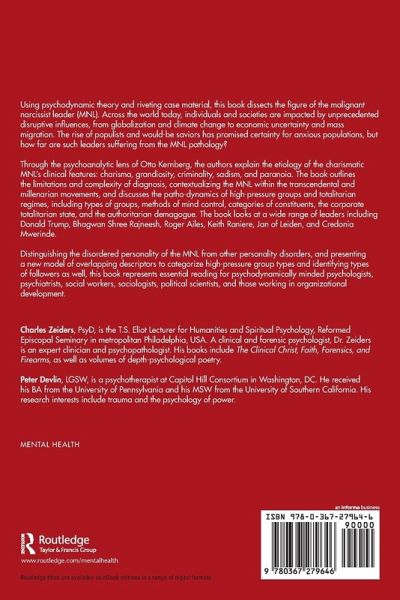 Through the psychoanalytic lens of Otto Kernberg, the authors explain the etiology of the charismatic MNL's clinical features: charisma, grandiosity, criminality, sadism, and paranoia. The book outlines the limitations and complexity of diagnosis, contextualizing the MNL within the transcendental and millenarian movements, and discusses the patho-dynamics of high-pressure groups and totalitarian regimes, including types of groups, methods of mind control, categories of constituents, the corporate totalitarian state, and the authoritarian demagogue. The book looks at a wide range of leaders including Donald Trump, Bhagwan Shree Rajneesh, Roger Ailes, Keith Raniere, Jan of Leiden, and Credonia Mwerinde.