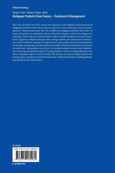 This book describes in detail current best practice in the diagnosis and treatment of malignant pediatric bone tumors and also discusses other important aspects of management. Clinical assessment, the role of different imaging modalities and choice of biopsy procedure are explained and an individual chapter is devoted to diagnostic pathology. The treatment-oriented chapters offer in-depth descriptions of chemotherapeutic regimens, radiation therapy, limb-salvage options and amputation-related issues and in addition consider the approach to lung nodules, the role of biomarkers, off-therapy monitoring and the treatment of relapse. Psychosocial impacts and needs are addressed and guidance provided on nursing during treatment and rehabilitation following orthopaedic surgery. Closing chapters evaluate emerging therapies and discuss disparate aspects of survivorship. The authors are acknowledged experts and include many contributors from the Nationwide Children's Hospital, a leading pediatric care facility in the United States.