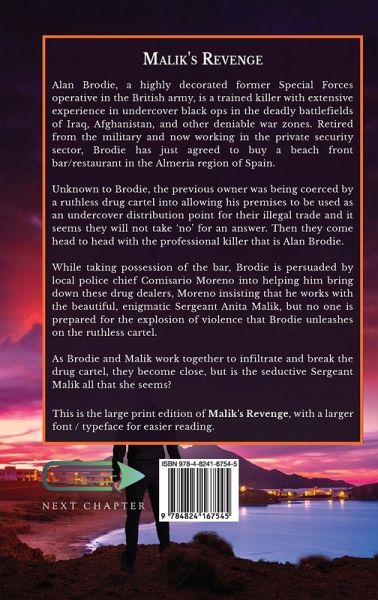 Alan Brodie, a highly decorated former Special Forces operative in the British army, is a trained killer with extensive experience in undercover black ops in the deadly battlefields of Iraq, Afghanistan, and other deniable war zones. Retired from the military and now working in the private security sector, Brodie has just agreed to buy a beach front bar/restaurant in the Almeria region of Spain. Unknown to Brodie, the previous owner was being coerced by a ruthless drug cartel into allowing his premises to be used as an undercover distribution point for their illegal trade and it seems they will not take 'no' for an answer. Then they come head to head with the professional killer that is Alan Brodie. While taking possession of the bar, Brodie is persuaded by local police chief Comisario Moreno into helping him bring down these drug dealers, Moreno insisting that he works with the beautiful, enigmatic Sergeant Anita Malik, but no one is prepared for the explosion of violence that Brodie unleashes on the ruthless cartel. As Brodie and Malik work together to infiltrate and break the drug cartel, they become close, but is the seductive Sergeant Malik all that she seems? This is the large print edition of Malik's Revenge, with a larger font / typeface for easier reading.