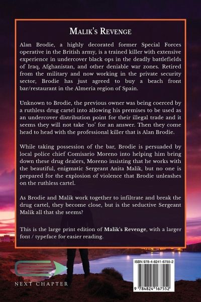 Alan Brodie, a highly decorated former Special Forces operative in the British army, is a trained killer with extensive experience in undercover black ops in the deadly battlefields of Iraq, Afghanistan, and other deniable war zones. Retired from the military and now working in the private security sector, Brodie has just agreed to buy a beach front bar/restaurant in the Almeria region of Spain. Unknown to Brodie, the previous owner was being coerced by a ruthless drug cartel into allowing his premises to be used as an undercover distribution point for their illegal trade and it seems they will not take 'no' for an answer. Then they come head to head with the professional killer that is Alan Brodie. While taking possession of the bar, Brodie is persuaded by local police chief Comisario Moreno into helping him bring down these drug dealers, Moreno insisting that he works with the beautiful, enigmatic Sergeant Anita Malik, but no one is prepared for the explosion of violence that Brodie unleashes on the ruthless cartel. As Brodie and Malik work together to infiltrate and break the drug cartel, they become close, but is the seductive Sergeant Malik all that she seems? This is the large print edition of Malik's Revenge, with a larger font / typeface for easier reading.