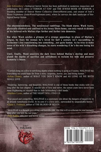 The absentmindedness. The nonsensical ramblings. The blank stares. Ward Ayers, physically disabled and confined to his Jersey Shore home, can only watch in dismay as his beloved wife Malina slips further and further into dementia. But when Ward catches a glimpse of a strange appendage in place of Malina's tongue, he fears the woman he's loved for half a century isn't succumbing to Alzheimer's but transforming into something...not quite human. As he tries to make sense of his wife's disturbing changes, he starts wondering if he's the one losing his mind. Until, finally, Ward uncovers the dark force behind Malina's decline and must plumb the depths of sacrifice and selfishness to reclaim his wife and preserve humanity's future. "Carried along on a dive to terrifying depths where nothing is quite as it seems, MALINAE has everything we could hope for from a story: suspense, horror, sex, and biting humor." -JoAnn Chaney, author of WHAT YOU DON'T KNOW and AS LONG AS WE BOTH SHALL LIVE "Haunting, harrowing, and beautiful, MALINAE is one of those books that sticks with you long after the last chapter. A seaside tale of love and terror, the sunset years have never been more frightening or visceral than in Josh Schlossberg's deft hands." -Matthew Lyons, author of THE NIGHT WILL FIND US "Fast paced and compelling, MALINAE is a cautionary tale about the dangers of negativity in an already tumultuous world. At its core it's a love story, surrounded by unspeakable horror." -Claire L. Fishback, author of THE BLOOD OF SEVEN "MALINAE is a thought provoking and horrific ride, one that will reverberate in your memory long after you turn the last page." -Gary Robbe, educator and horror writer