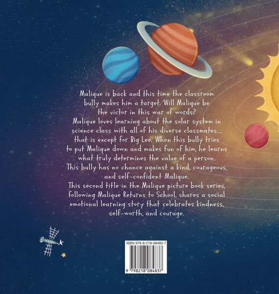Malique is back and this time the classroom bully makes him a target. Will Malique be the victor in this war of words? Malique loves learning about the solar system in science class with all of his diverse classmates...that is except for Big Lee. When this bully tries to put Malique down and makes fun of him, he learns what truly determines the value of a person. This bully has no chance against a kind, courageous, and self-confident Malique. This second title in the Malique picture book series, following Malique Returns to School, shares a social-emotional learning story that celebrates kindness, self-worth, and courage.