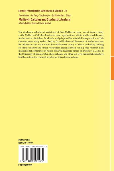 An Application of Gaussian Measures to Functional Analysis.- Stochastic Taylor Formulas and Riemannian Geometry.- Local invertibility of adapted shifts on Wiener Space and related topics.- Dilation vector field on Wiener space.- The calculus of differentials for the weak Stratonovich integral.- Large deviations for Hilbert space valued Wiener processes: a sequence space approach.- Stationary distributions for jump processes with inert drift.- An Ornstein-Uhlenbeck type process which satisfies sufficient conditions for a simulation based filtering procedure.- Escape probability for stochastic dynamical systems with jumps.- On Stochastic Navier-Stokes Equation Driven by Stationary White Noise.- Intermittency and chaos for a non-linear stochastic wave equation in dimension 1.- Generalized stochastic heat equations.- Gaussian Upper Density estimates for spatially homogeneous Stochastic PDEs.- Stationarity of the solution for the semilinear stochastic integral equation on the whole real line.- A strong approximation of sub-fractional Brownian motion by means of transport processes.- Malliavin calculus for fractional heat equation.- Parameter estimation for alpha-fractional bridges.- Gradient bounds for solutions of stochastic differential equations driven by fractional Brownian motion.- Parameter estimation for fractional Ornstein-Uhlenbeck processes with discrete observations.- The effect of competition on the height and length of the forest of genealogical trees of a large population.- Linking progressive and initial filtration expansions.- A Malliavin calculus approach to general stochastic differential games with partial information.- Asymptotics for the Length of Longest Increasing Subsequences of Binary Markovian Words.- A short rate model using ambit processes.- Parametric regularity of the conditional expectations via the Malliavin calculus and applications.