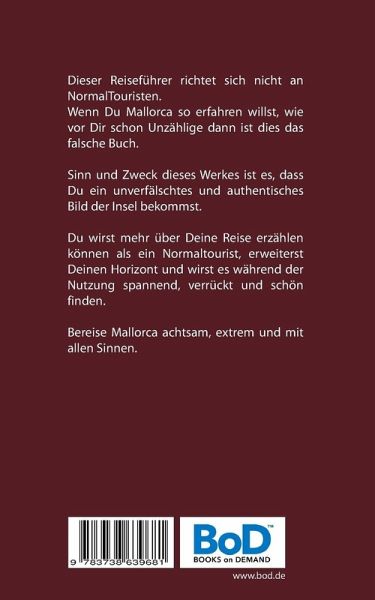 Dieser Reiseführer richtet sich nicht an NormalTouristen. Wenn Du Mallorca so erfahren willst, wie vor Dir schon Unzählige dann ist dies das falsche Buch. Sinn und Zweck dieses Werkes ist es, dass Du ein unverfälschtes und authentisches Bild der Insel bekommst.Du wirst mehr über Deine Reise erzählen können als ein Normaltourist, erweiterst Deinen Horizont und wirst es während der Nutzung spannend, verrückt und schön finden. Bereise Mallorca achtsam, extrem und mit allen Sinnen.