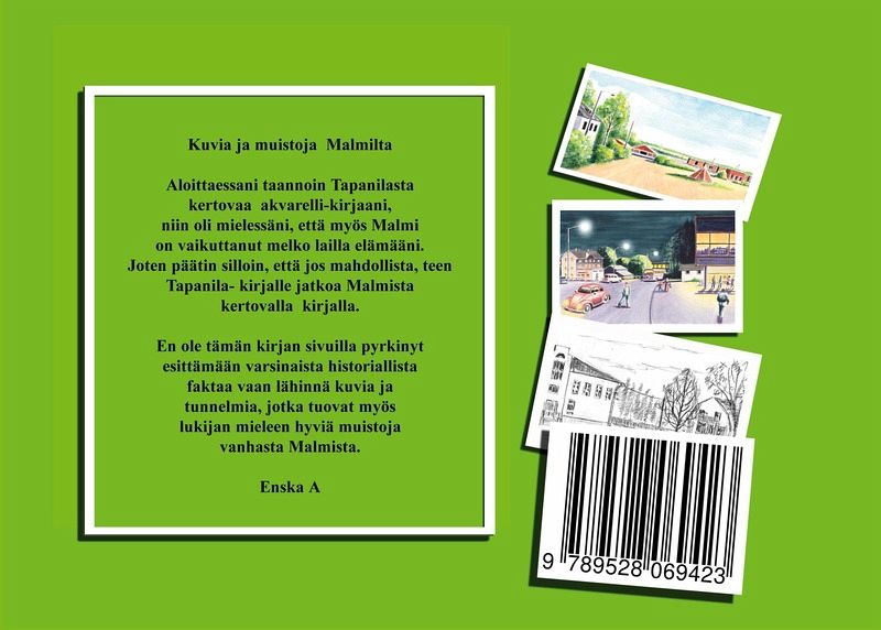 Kuvia ja muistoja Malmilta Aloittaessani taannoin Tapanilasta kertovaa akvarelli kirjaani, niin oli mielessäni, että myös Malmi on vaikuttanut melko lailla elämääni. Joten päätin silloin että jos mahdollista teen Tapanila kirjalle jatkoa Malmista kertovalla kirjalla. En ole tämän kirjan sivuilla pyrkinyt esittämää varsinaista historiallista faktaa vaan lähinnä kuvia ja tunnelmia jotka tuovat myös lukijan mieleen hyviä muistoja vanhasta Malmista. Enska A