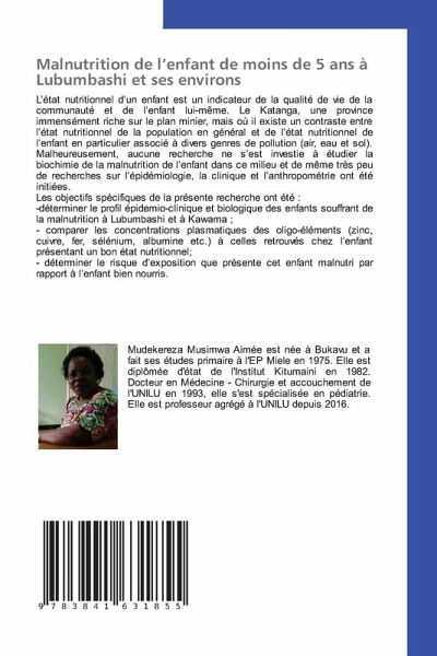L'état nutritionnel d'un enfant est un indicateur de la qualité de vie de la communauté et de l'enfant lui-même. Le Katanga, une province immensément riche sur le plan minier, mais où il existe un contraste entre l'état nutritionnel de la population en général et de l'état nutritionnel de l'enfant en particulier associé à divers genres de pollution (air, eau et sol). Malheureusement, aucune recherche ne s'est investie à étudier la biochimie de la malnutrition de l'enfant dans ce milieu et de même très peu de recherches sur l'épidémiologie, la clinique et l'anthropométrie ont été initiées. Les objectifs spécifiques de la présente recherche ont été : -déterminer le profil épidemio-clinique et biologique des enfants souffrant de la malnutrition à Lubumbashi et à Kawama ;- comparer les concentrations plasmatiques des oligo-éléments (zinc, cuivre, fer, sélénium, albumine etc.) à celles retrouvés chez l'enfant présentant un bon état nutritionnel;- déterminer le risque d'exposition que présente cet enfant malnutri par rapport à l'enfant bien nourris.