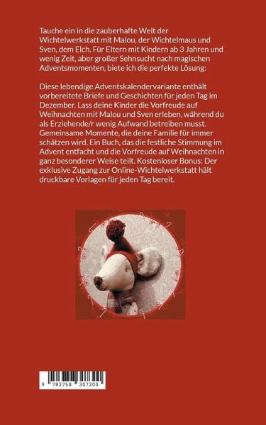 Tauche ein in die zauberhafte Welt der Wichtelwerkstatt mit Malou, der Wichtelmaus und Sven, dem Elch. Für Eltern mit Kindern ab 3 Jahren und wenig Zeit, aber großer Sehnsucht nach magischen Adventsmomenten, biete ich die perfekte Lösung:Diese lebendige Adventskalendervariante enthält vorbereitete Briefe und Geschichten für jeden Tag im Dezember. Lass deine Kinder die Vorfreude auf Weihnachten mit Malou und Sven erleben, während du als Erziehende/r wenig Aufwand betreiben musst. Gemeinsame Momente, die deine Familie für immer schätzen wird. Ein Buch, das die festliche Stimmung im Advent entfacht und die Vorfreude auf Weihnachten in ganz besonderer Weise teilt. Kostenloser Bonus: Der exklusive Zugang zur Online-Wichtelwerkstatt hält druckbare Vorlagen für jeden Tag bereit.