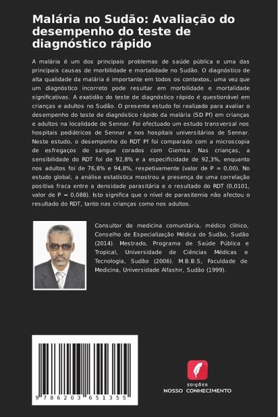 A malária é um dos principais problemas de saúde pública e uma das principais causas de morbilidade e mortalidade no Sudão. O diagnóstico de alta qualidade da malária é importante em todos os contextos, uma vez que um diagnóstico incorreto pode resultar em morbilidade e mortalidade significativas. A exatidão do teste de diagnóstico rápido é questionável em crianças e adultos no Sudão. O presente estudo foi realizado para avaliar o desempenho do teste de diagnóstico rápido da malária (SD Pf) em crianças e adultos na localidade de Sennar. Foi efectuado um estudo transversal nos hospitais pediátricos de Sennar e nos hospitais universitários de Sennar. Neste estudo, o desempenho do RDT Pf foi comparado com a microscopia de esfregaços de sangue corados com Giemsa. Nas crianças, a sensibilidade do RDT foi de 92,8% e a especificidade de 92,3%, enquanto nos adultos foi de 76,8% e 94,8%, respetivamente (valor de P = 0,00). No estudo global, a análise estatística mostrou a presença de uma correlação positiva fraca entre a densidade parasitária e o resultado do RDT (0,0101, valor de P = 0,088). Isto significa que o nível de parasitemia não afectou o resultado do RDT, tanto nas crianças como nos adultos.