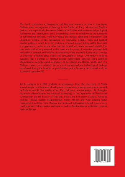 This book synthesises archaeological and historical research in order to investigate Maltese water management technology in the Medieval, Early Modern and Modern periods, more specifically between AD 900 and AD 1900. Maltese terrestrial geological formations and stratification are a determining factor in conditioning the formation of subterranean aquifers, water-harvesting and storage, landscape development and utilisation. Central to this publication are reservoirs, cisterns, wells and perched aquifer galleries, which have for centuries provided farmers tilling arable land with a supplementary water source other than the limited and erratic seasonal rainfall. The data and conclusions presented in this book are the result of extensive personal field and archival research and include an assessment of the available documentary sources of evidence, including place names and cartographic sources. Comparative research suggests that a number of perched aquifer subterranean galleries share common characteristics with the qanat technology of the Islamic and Roman worlds and, in a Maltese context, were possibly part of a new agricultural and technological package introduced during the Muslim or post-Muslim period between the eleventh and the fourteenth centuries AD.