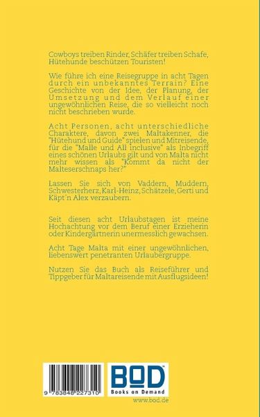 Cowboys treiben Rinder, Schäfer treiben Schafe, Hütehunde beschützen Reisegruppen!Aber wer schützt die Hütehunde?Wie führe ich eine Gruppe "Touristos Germanos Kurzhosos" durch unbekanntes Terrain.Eine Geschichte von der Idee, der Planung, der Umsetzung und dem Verlauf einer Reise, die auf diese Art vielleicht noch nicht beschrieben wurde.Acht Tage Malta mit einer ungewöhnlichen, liebenswert penetranten Urlaubergruppe, für die "Malle All inclusiv" der Inbegriff eines Urlaubs ist.Lassen Sie sich von den Teilnehmern verzaubern. Seit dieser Reise ist meine Hochachtung für den Beruf einer Erzieherin/Kindergärtnerin unermesslich gestiegen!Zwei Bücher in einem:Roman und Reiseführer über Malta