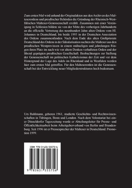 Zum ersten Mal wird anhand der Originalakten aus den Archiven des Malteserordens und preußischer Behörden die Gründung der Rheinisch-Westfälischen Malteser-Genossenschaft erzählt. Zusammen mit einer Vereinigung in Schlesien bildete sie von der Mitte des vorherigen Jahrhunderts an die offizielle Vertretung des neunhundert Jahre alten Ordens vom Hl. Johannes in Deutschland, bis beide 1993 in der Deutschen Assoziation des Ordens zusammenfanden. Nach dem Ende des alten Großpriorats Deutschland des Ordens in der Säkularisation suchten die Malteser aus den preußischen Westprovinzen in einem mühseligen und jahrelangen Ringen ihren Platz im nach wie vor altem Denken verhafteten Orden und der liberal geprägten preußischen Gesellschaft. Beobachtungen zur Stellung der Genossenschaft im politischen Katholizismus der Zeit und vor dem Hintergrund der Lage des Adels im Rheinland und in Westfalen werden hier zum ersten Mal getroffen. Für den Malteserorden ist die Genossenschaft bei der Entwicklung neuer Mitgliederstrukturen hoch bedeutsam.