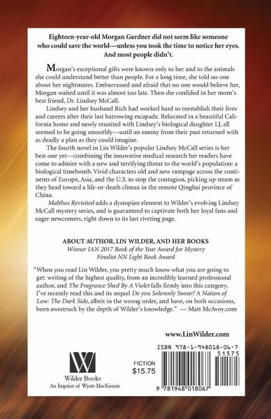 MALTHUS REVISITED The Cup of Wrath A Lindsey McCall Medical Mystery by Lin Wilder Eighteen-year-old Morgan Gardner did not seem like someone who could save the world-unless you took the time to notice her eyes. And most people didn't. Morgan's exceptional gifts were known only to her and to the animals she could understand better than people. For a long time, she told no one about her nightmares. Embarrassed and afraid that no one would believe her, Morgan waited until it was almost too late. Then she confided in her mom's best friend, Dr. Lindsey McCall. Lindsey and her husband Rich had worked hard to reestablish their lives and careers after their last harrowing escapade. Relocated in a beautiful California home and newly reunited with Lindsey's biological daughter LJ, all seemed to be going smoothly-until an enemy from their past returned with as deadly a plan as they could imagine. The fourth novel in Lin Wilder's popular Lindsey McCall series is her best one yet-combining the innovative medical research her readers have come to admire with a new and terrifying threat to the world's population: a biological timebomb. Vivid characters old and new rampage across the continents of Europe, Asia, and the U.S. to stop the contagion, picking up steam as they head toward a life-or-death climax in the remote Qinghai province of China. Malthus Revisited adds a dystopian element to Wilder's evolving Lindsey McCall mystery series, and is guaranteed to captivate both her loyal fans and eager newcomers, right down to its last riveting page.