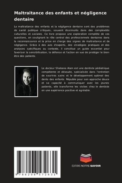 La maltraitance des enfants et la négligence dentaire sont des problèmes de santé publique critiques, souvent dissimulés dans des complexités culturelles et sociales. Ce livre propose une exploration complète de ces questions, en soulignant le rôle central des professionnels dentaires dans la reconnaissance et la prise en charge des signes de maltraitance et de négligence. Grâce à des avis d'experts, des stratégies pratiques et des analyses spécifiques au contexte, il constitue un guide essentiel pour favoriser la sensibilisation, la défense et l'action en vue de protéger le bien-être des patients.