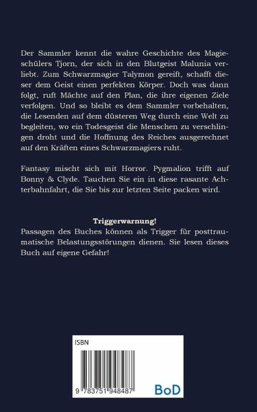 Der Sammler kennt die wahre Geschichte des Magieschülers Tjorn, der sich in den Blutgeist Malunia verliebt. Zum Schwarzmagier Talymon gereift, schafft dieser dem Geist einen perfekten Körper. Doch was dann folgt, ruft Mächte auf den Plan, die ihre eigenen Ziele verfolgen. Und so bleibt es dem Sammler vorbehalten, die Lesenden auf dem düsteren Weg durch eine Welt zu begleiten, wo ein Todesgeist die Menschen zu verschlingen droht und die Hoffnung des Reiches ausgerechnet auf den Kräften eines Schwarzmagiers ruht.Fantasy mischt sich mit Horror. Pygmalion trifft auf Bonny & Clyde. Tauchen Sie ein in diese rasante Achterbahnfahrt, die Sie bis zur letzten Seite packen wird. Triggerwarnung!Passagen des Buches können als Trigger für posttraumatische Belastungsstörungen dienen. Sie lesen dieses Buch auf eigene Gefahr!
