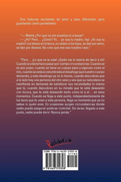 Dos historias excitantes de amor y sexo diferentes, pero guardando cierto paralelismo. "- Mamá ¿Por qué no me enseñas tú a besar? - ¿Yo? Pero... ¿Cómo? Yo... yo soy tu madre, hijo. ¡Yo soy tu madre! Los besos en la boca, no sedan a los hijos, se dan por amor, se dan por deseos. No creo que ese sea nuestro caso." "Pero... ¡Lo que es la vida! ¡Quién me lo habría de decir a mí! Cuando la vida te hace pasar por ciertas circunstancias. Cuando se es aún joven, cuando se tiene un cuerpo sano y vigoroso como el mío, cuando se está acostumbrada al desahogo que nuestro cuerpo demanda, y este desahogo ya no lo tienes, cuando descubres que a tú lado hay una persona del otro sexo y ves que su naturaleza se manifiesta en demanda de satisfacer sus necesidades lo mismo que tú, cuando descubres en su mirada que te está deseando con locura, que te está deseando tanto como tú a el... en esos momentos. Cuando se llega a este punto, independientemente de los lazos que te unan a esta persona, llega un momento que ya no sabes ni quién eres. En ocasiones surgen circunstancias donde nadie puede asegurar poderse controlar. De veras; llegado a este punto, nadie puede decir: Nunca jamás."