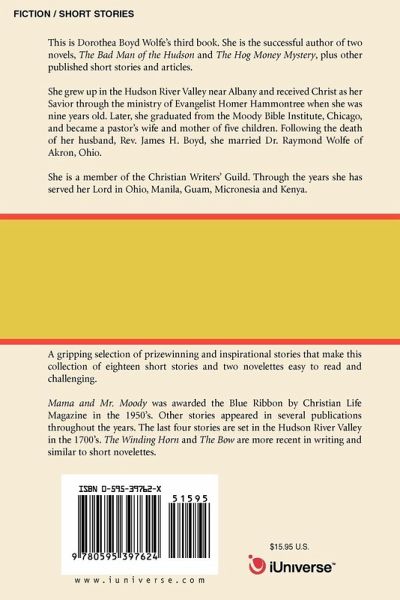 A gripping selection of prizewinning and inspirational stories that make this collection of eighteen short stories and two novelettes easy to read and challenging. Mama and Mr. Moody was awarded the Blue Ribbon by Christian Life Magazine in the 1950's. Other stories appeared in several publications throughout the years. The last four stories are set in the Hudson River Valley in the 1700's. The Winding Horn and The Bow are more recent in writing and similar to short novelettes.