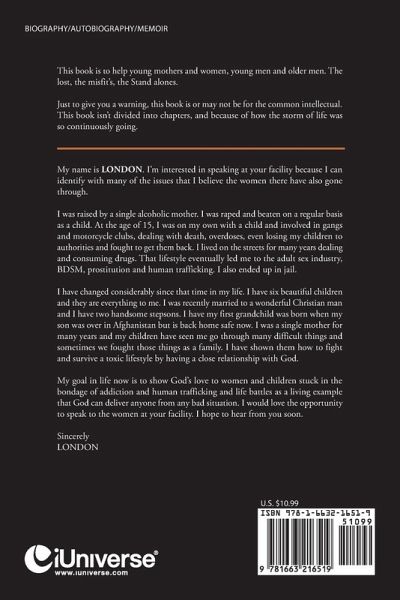 This book is to help young mothers and women, young men and older men. The lost, the misfit's, the Stand alones. Just to give you a warning, this book is or may not be for the common intellectual. This book isn't divided into chapters, and because of how the storm of life was so continuously going.