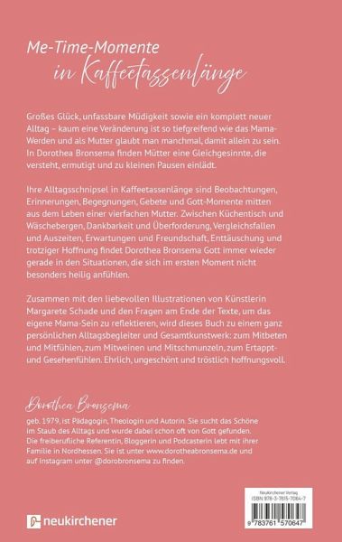 Großes Glück, unfassbare Müdigkeit sowie ein komplett neuer Alltag kaum eine Veränderung ist so tiefgreifend wie das Mama-Werden und als Mutter glaubt man manchmal, damit allein zu sein. In Dorothea Bronsema finden Mütter eine Gleichgesinnte, die versteht, ermutigt und zu kleinen Pausen einlädt. In wunderschöner Sprache und dennoch authentisch und ehrlich schreibt sie aus ihrem Mama-Leben: Zwischen Wäschekörben und langen Abenden am Laptop fragt sie sich, wer sie eigentlich ist, berichtet über Tränen und den ungnädigen Blick auf ihren Körper. Sie betet in Stoßgebeten und merkt, dass auch ihr Glaube sich verändert hat. Ohne Perfektionsdruck und ohne andere Mütter zu verurteilen, teilt sie ihre Erfahrungen und Gedanken zu Gott, Mutterschaft und Frausein. So schafft sie es, auch schwierige Themen sensibel und hoffnungsvoll anzusprechen. Ein Buch für kurze Me-Time-Momente mit Texten in elterntauglicher Kaffeetassenlänge, die so herzerwärmend sind, dass es auch egal ist, wenn dieser mal wieder kalt geworden ist. Ein Buch für Nachdenkliche, für Gottsucherinnen und jede Mutter, die etwas Zuspruch und Ermutigung gebrauchen kann.Liebevoll gestaltet mit Handlettering von Künstlerin Margarete Schade ist es ein wunderschönes Geschenk zur Geburt, zum Muttertag oder einfach für sich selbst, um im vollen Alltag Kraft zu tanken.Mit beiligender Postkarte.