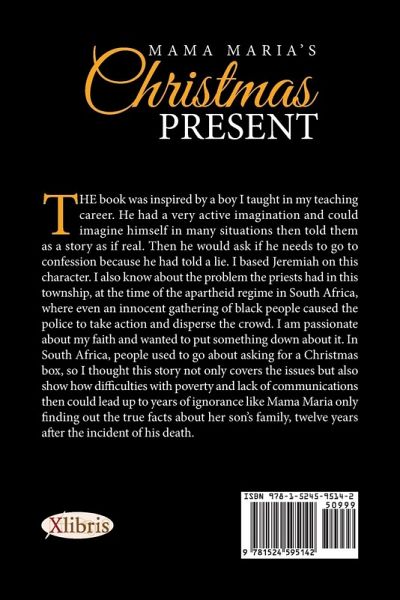 The book was inspired by a boy I taught in my teaching career. He had a very active imagination and could imagine himself in many situations then told them as a story as if real. Then he would ask if he needs to go to confession because he had told a lie. I based Jeremiah on this character. I also know about the problem the priests had in this township, at the time of the apartheid regime in South Africa, where even an innocent gathering of black people caused the police to take action and disperse the crowd. I am passionate about my faith and wanted to put something down about it. In South Africa, people used to go about asking for a Christmas box, so I thought this story not only covers the issues but also show how difficulties with poverty and lack of communications then could lead up to years of ignorance like Mama Maria only finding out the true facts about her son's family, twelve years after the incident of his death.