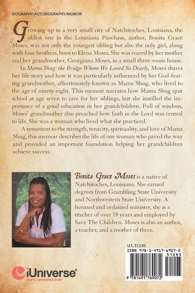 Growing up in a very small city, Natchitoches, Louisiana, the oldest one in the Louisiana Purchase, author Bonita Grace Moses was not only the youngest sibling but also the only girl out of four brothers born to Elena Moses. She was reared by her mother and her grandmother, Georgiana Moses, in a small house that had three rooms. In Mama Shug: the Bridge Whom We Loved So Dearly, Moses shares her life story and how it was particularly influenced by her God-fearing grandmother, affectionately known as Mama Shug, who lived to the age of ninety-eight. This memoir narrates how Mama Shug quit school at age seven to care for her siblings, but she instilled the importance of a good education in her grandchildren. Full of wisdom, Moses' grandmother also preached how faith in the Lord was central to life. She was a woman who lived what she practiced. A testament to the strength, tenacity, spirituality, and love of Mama Shug, this memoir describes the life of one woman who paved the way and provided an important foundation, helping her grandchildren achieve success in the world.